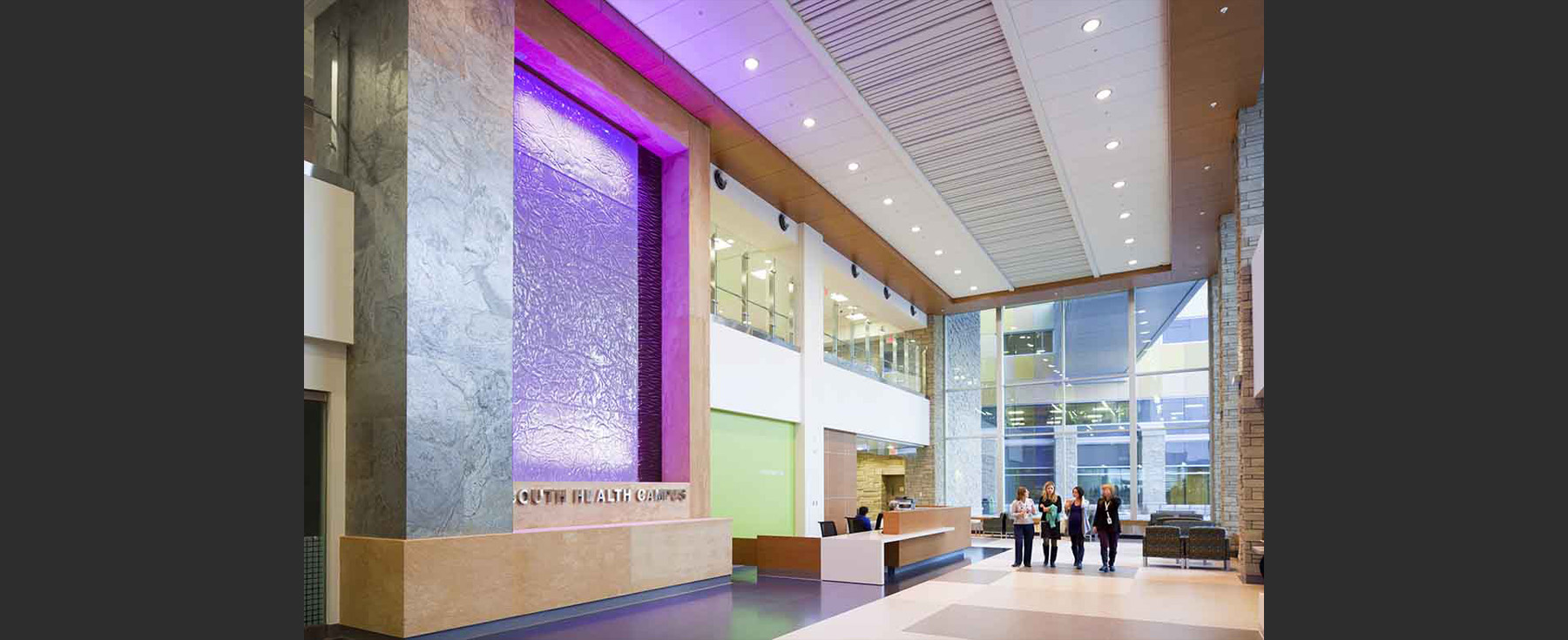 Stretching 44 acres, the South Health Campus resembles a student village, aptly reflecting the campus concept. Each building is distinct yet interconnected, creating a ‘village feel’ rather than an institutional, monolithic coldness. An indoor, pedestrian public street extends east-west across the campus, connecting all services, creating direct access to parking. and providing direct circulation to all clinical services. This internal street is also the main circulation spine and contains street zoning for education, community activities, and multi-use, including retail, food and beverage amenities.
