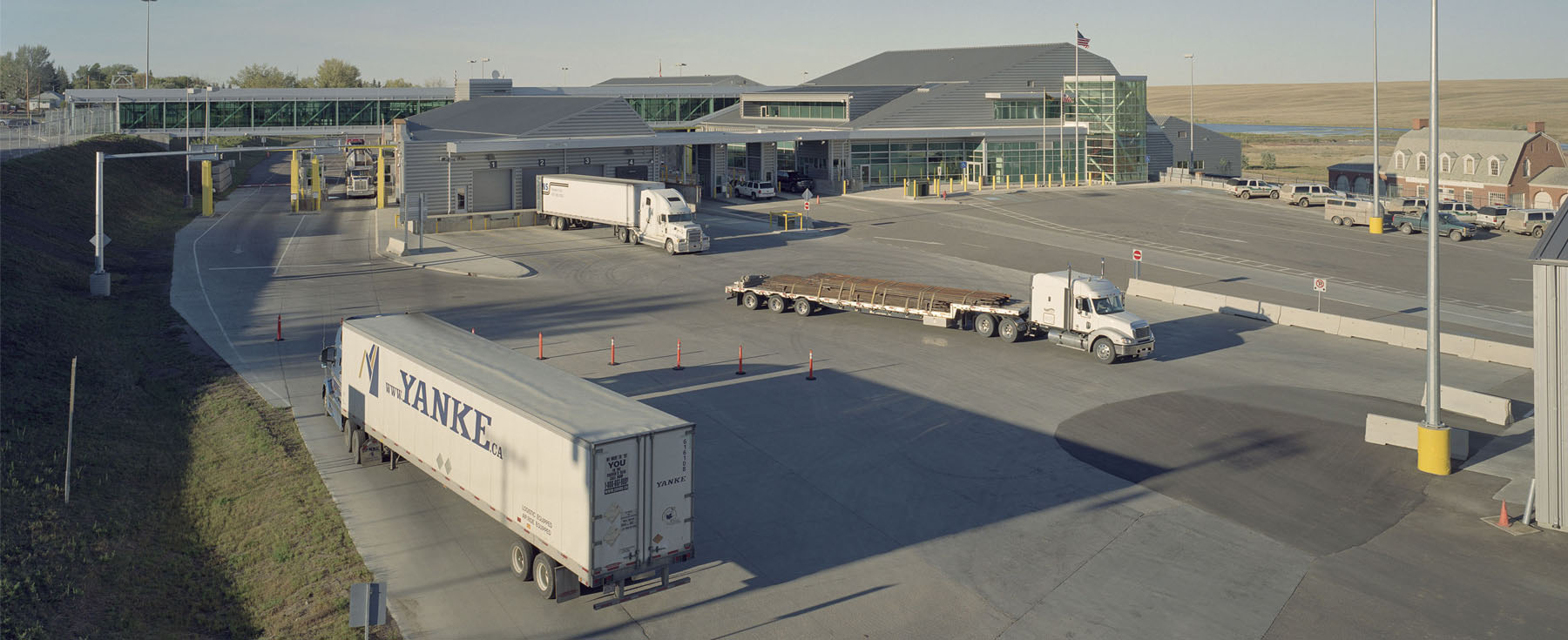 The Coutts-Sweetgrass Border crossing linking Alberta and Montana includes a three-storey, 6000 sqm main processing building and six ancillary buildings. This border processes both traveller and commercial vehicle traffic. The main building is an integrated US and Canadian border services facility that spans the border between the US and Canada. A glass-enclosed bridge divides the two halves of the building and serves as a main circulation spine and access point to the building from the adjacent communities of Sweetgrass and Coutts.