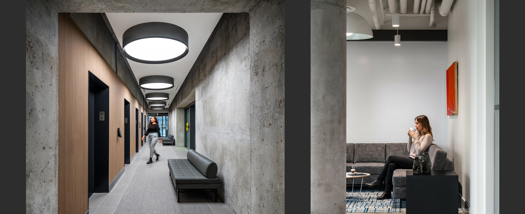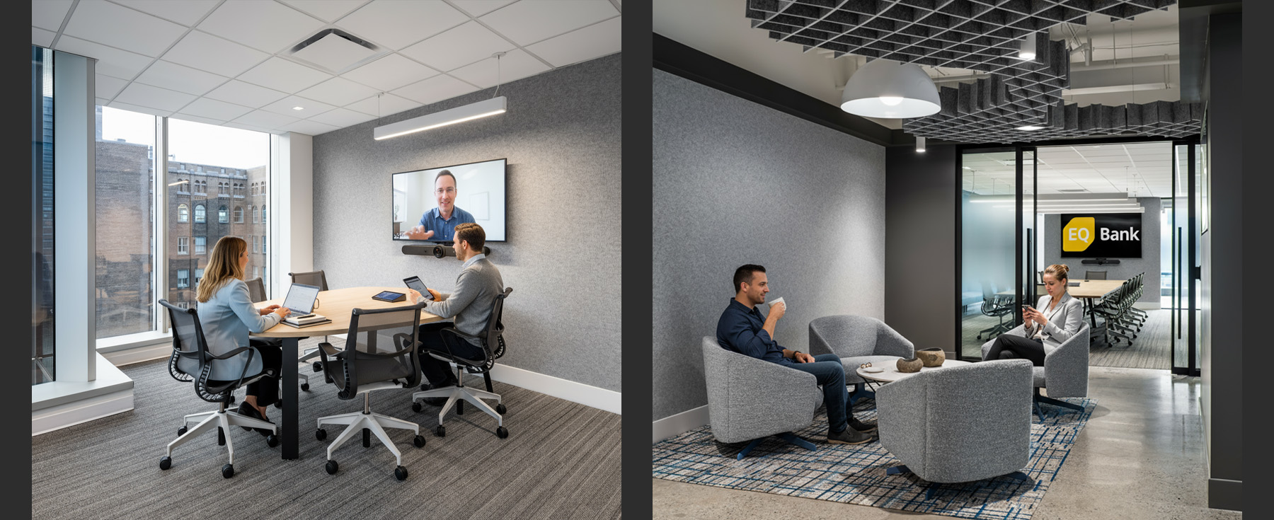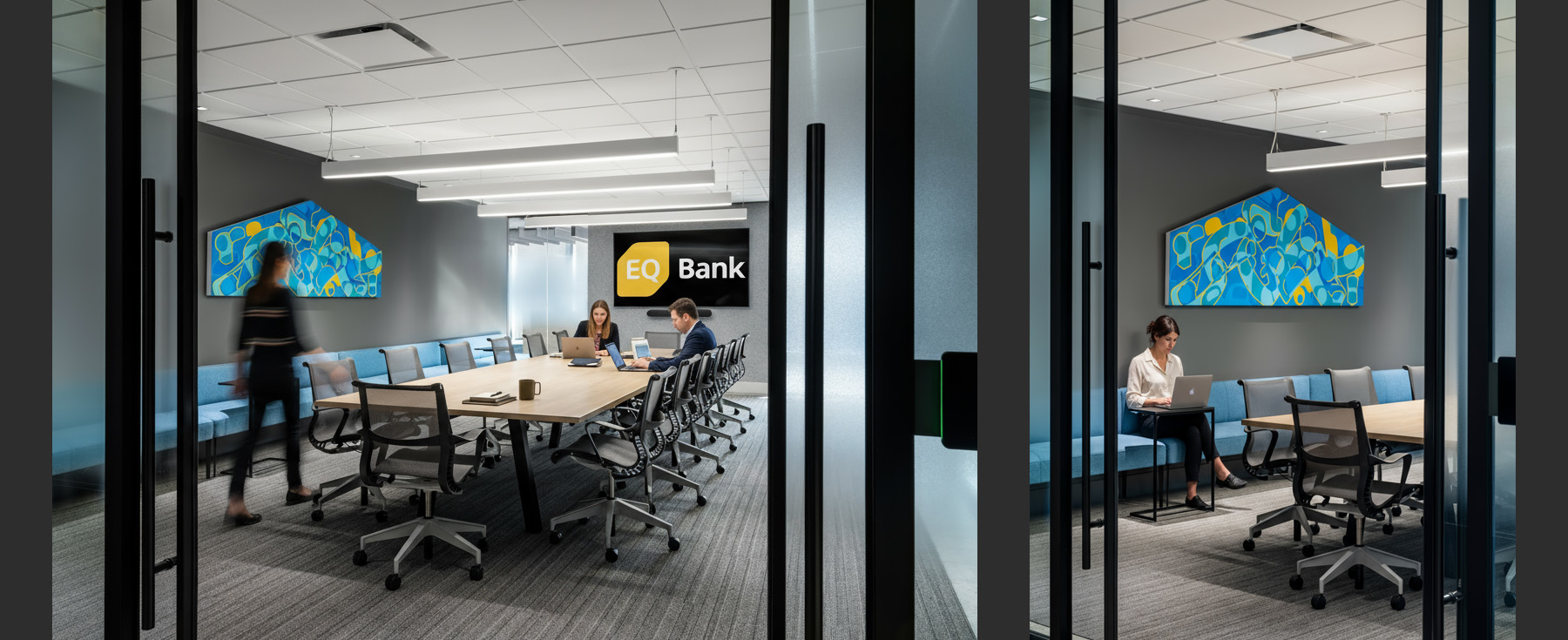 The design emphasizes flexibility, branding, and user experience. Dichroic film was used as a cost-effective way to showcase EQ Bank’s brand colours through shifting light and color, bringing movement and energy to the space. Open ceilings, careful acoustic planning, and a mix of settings, including social hubs, team zones, and quiet focus areas, were incorporated to foster creativity and support well-being. Ergonomic furniture and advanced audiovisual systems support effective teamwork and smooth communication in both in-person and virtual settings.
