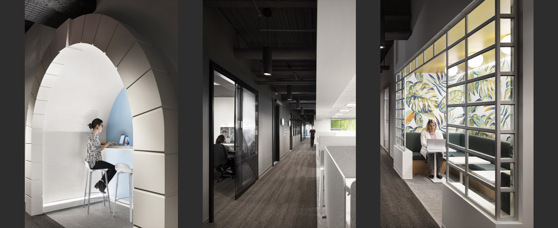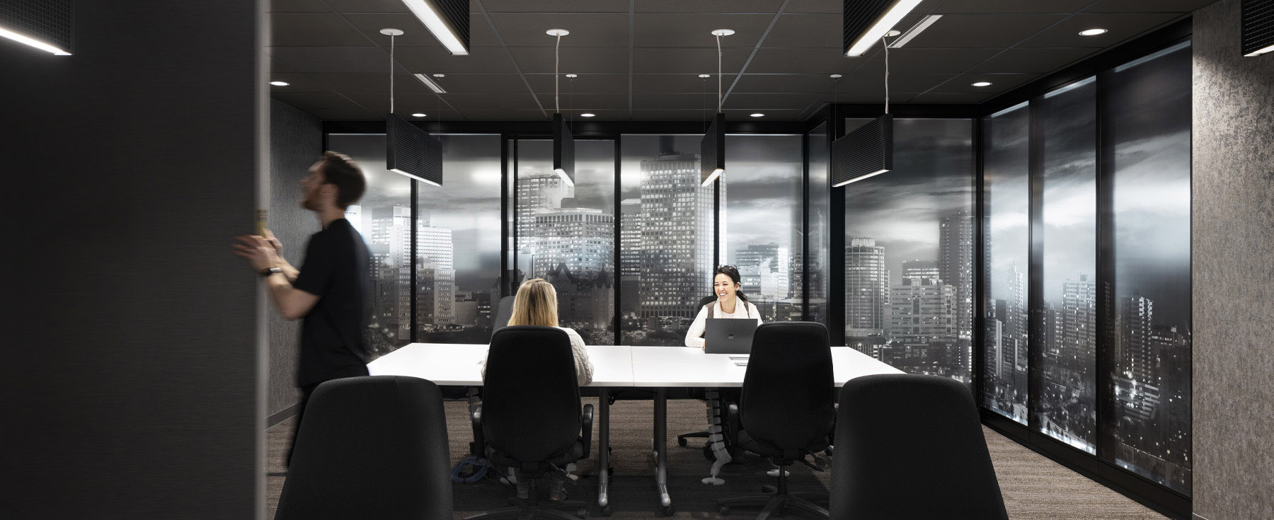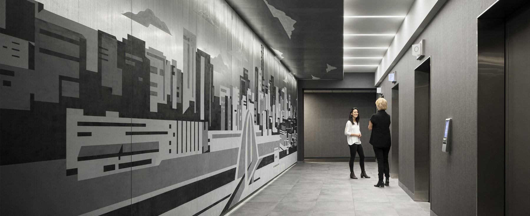 Double-layered glass with black and white city photography creates an immersive 3D effect, grounding the space in its urban context. Local artwork and photography sourced from Edmonton vendors enhance each zone, reinforcing a sense of place and community.