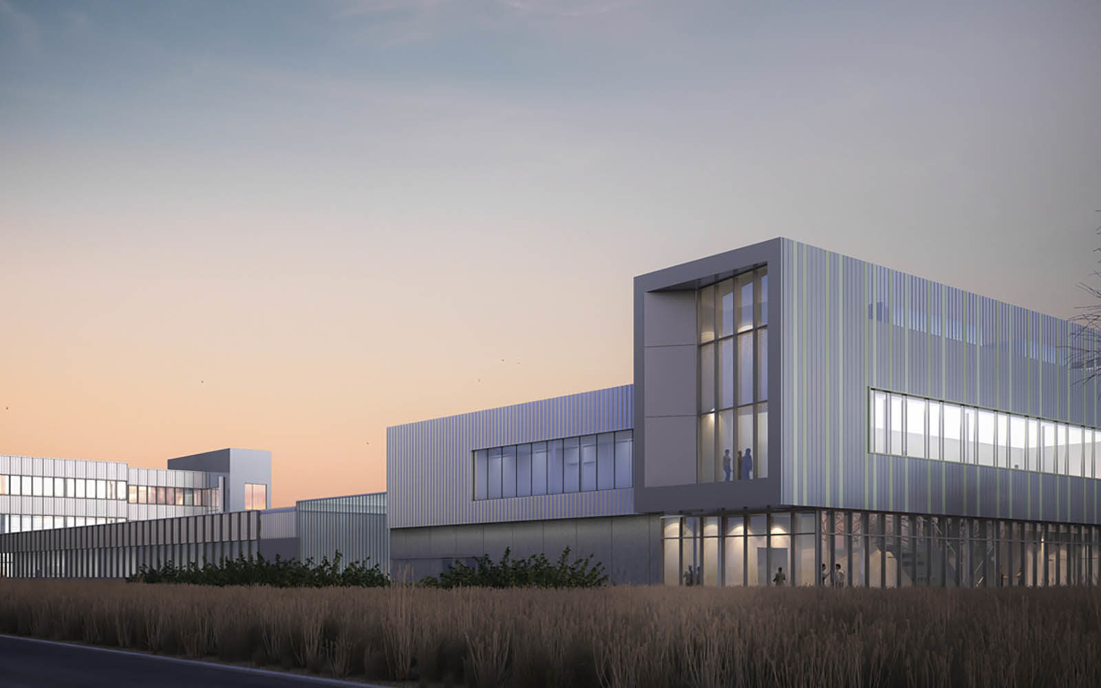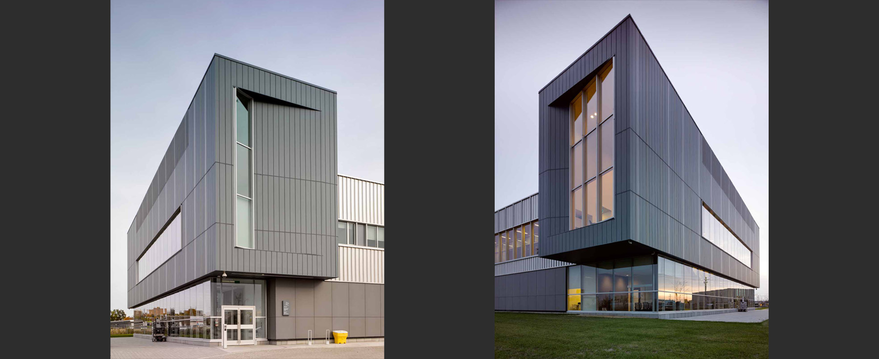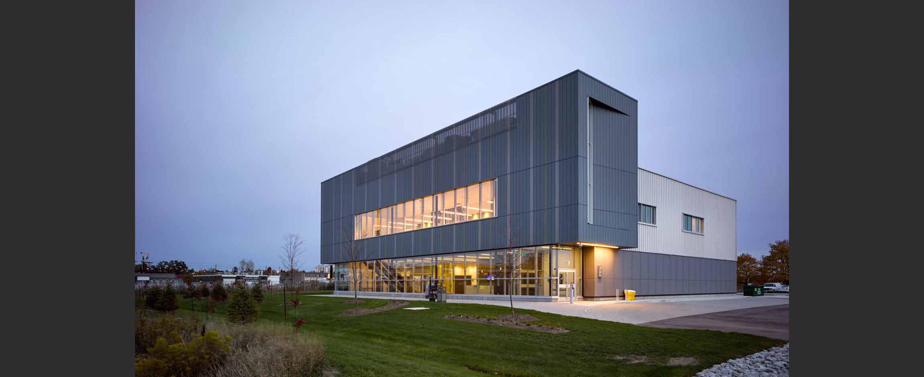 The CETI incorporates research labs, high-density storage, garages, a wellness centre, break rooms, and a three-storey administration building. Entry pavilions rendered in green, grey, and charcoal zinc slats punctuate the composition. All buildings on the campus have green roofs, helping achieve LEED Silver certification.