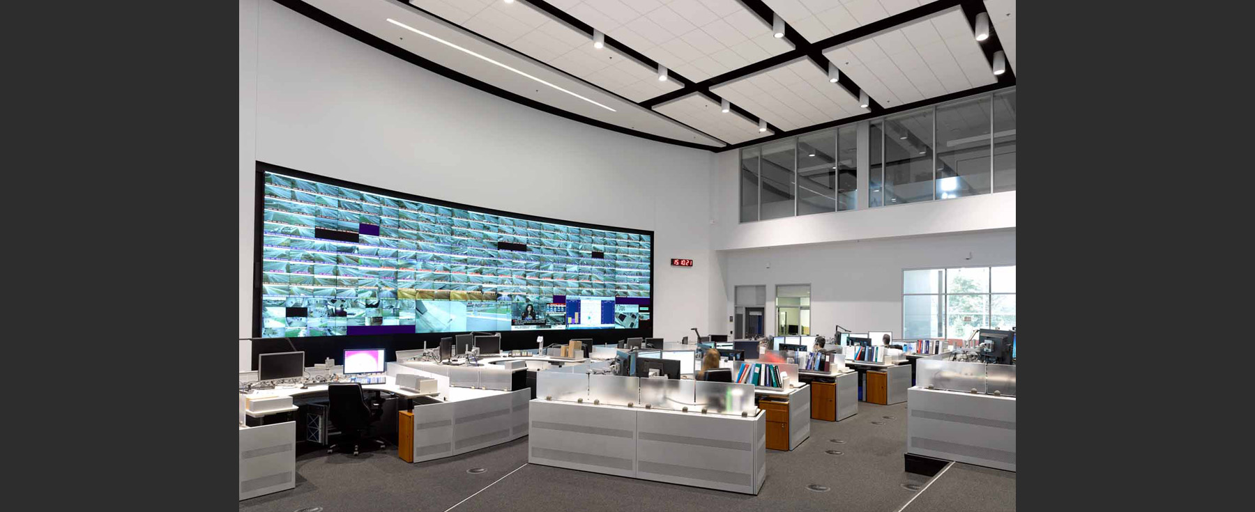 A theme of “the roadway” informed the design, showcasing raw materials such as aluminium, steel, concrete, and aggregate. The TOC combines advanced technology with flexible comfort. Expansive windows provide daylight and highway views, while glazed ground-floor walls buffer workstations equipped with ergonomic and climate-control features. Upper-level meeting spaces host training and staff gatherings in naturally lit settings.