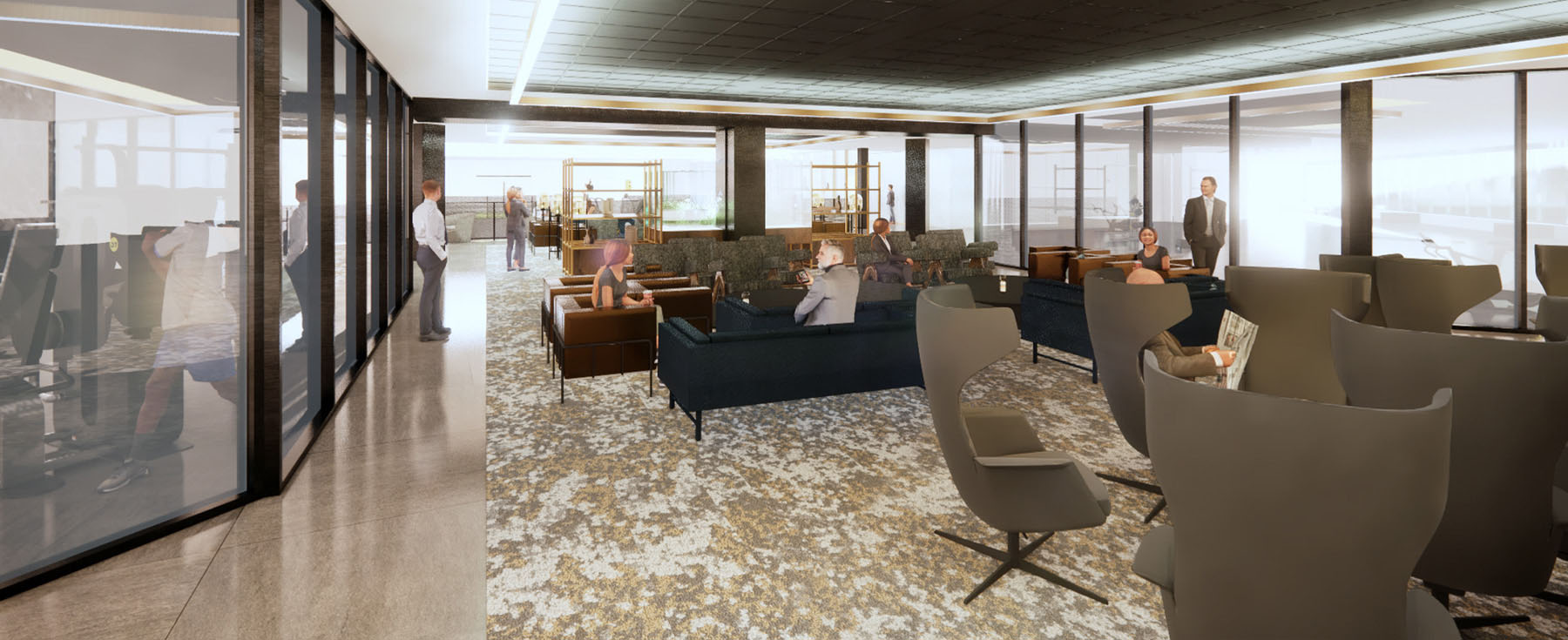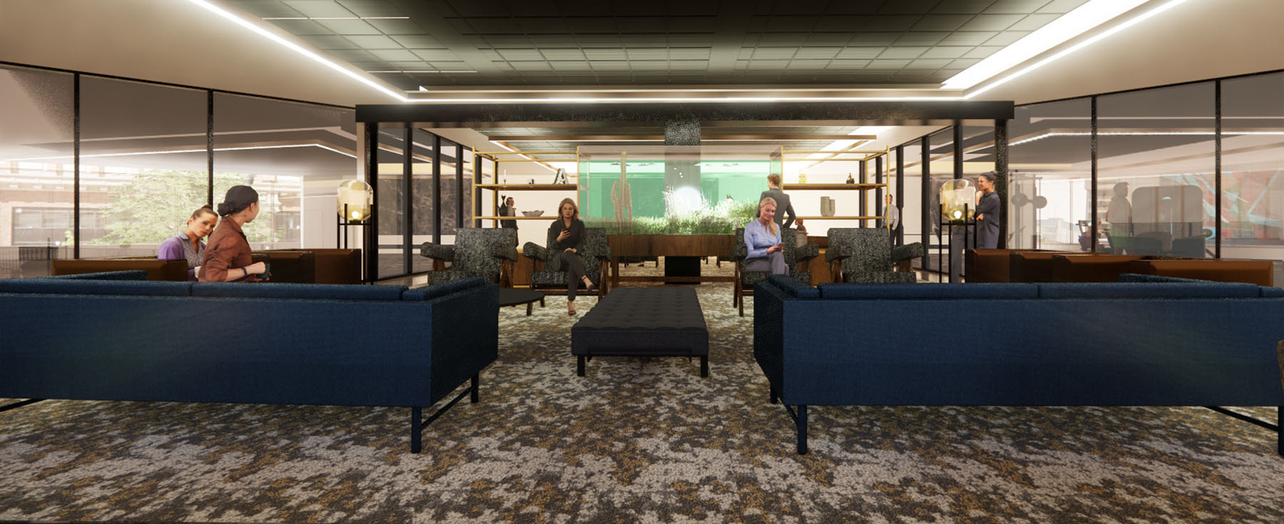 The main floor will be converted into a vibrant food hall after the previous food court and retail spaces lacked the appeal to attract people into the building. Clients will have spaces to work or hold casual meetings with more collaborative seating on the main level. The elevator lobbies will be redeveloped and reclad with the floor near the escalators infilled to create additional soft seating areas.