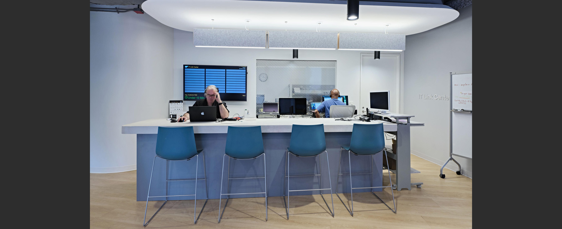 Workstations line the perimeter to maximize natural light and views of the Toronto skyline and waterfront. A large client-facing zone with high-quality finishes showcases SAP’s brand and creates a welcoming arrival for visitors and partners.