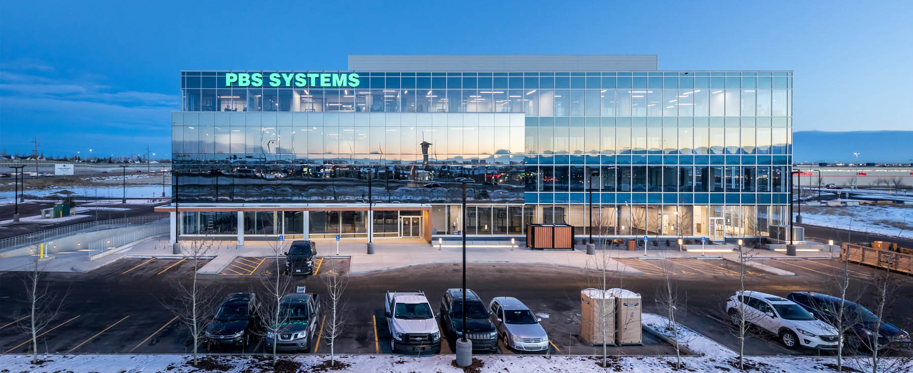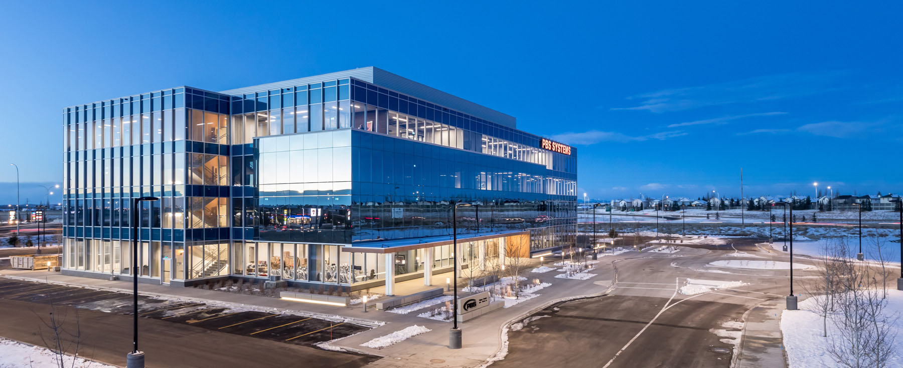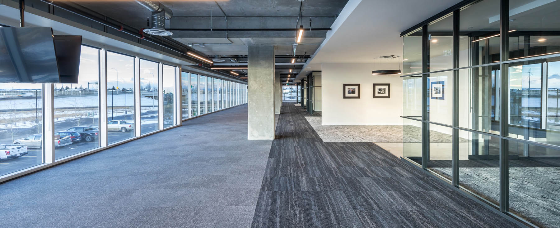 Building #1, at the south end of the main street, is four storeys in height and is approximately 85,000 SF in area. Given the potential construction time frame to develop the entire site, careful consideration was given to the building facades and materials. A ‘kit of parts’ was developed, which included a combination of curtain wall materials and aluminum caps, build-outs on some floors (picture frame), balconies, expansive entry canopies, and wayfinding.