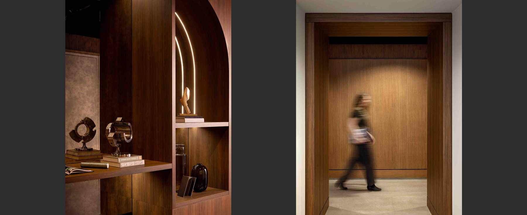 The space communicates a strong brand presence, grounded in warm wood panelling, dual-tone concrete flooring, and curved glazed walls that soften the aesthetic with its hospitality and mid-century modern influence.