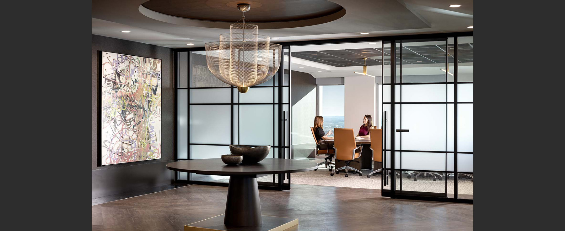 The design merges traditional law office needs, such as privacy and a variety of meeting room sizes, with a future-forward, equitable layout that benefits all staff. Drawing inspiration from luxury hospitality, carefully selected finishes balance professionalism with warmth, with thoughtful consideration of durability, sustainability, and budget.