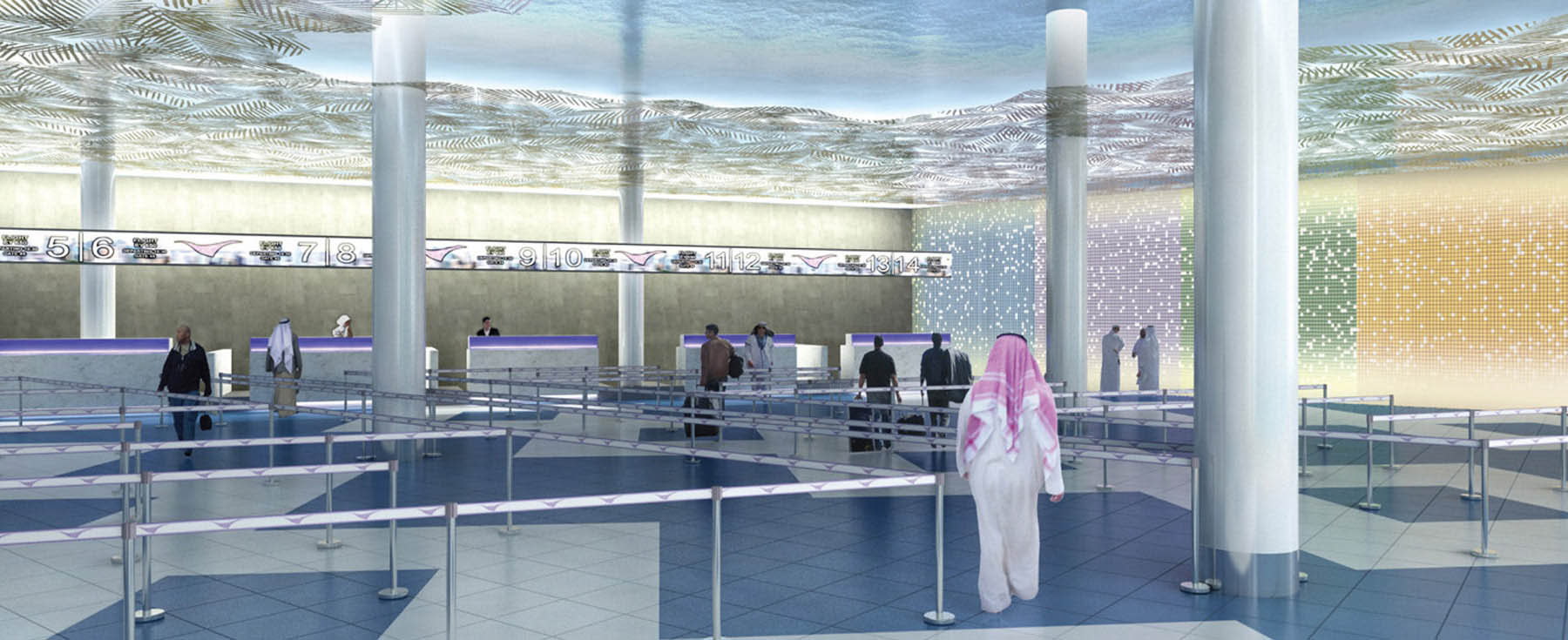 The concept creates a distinctive brand for the airport by using light to enhance wayfinding and passenger flow and most importantly as the symbolic thread for tying together an eternal and captivating story of life, land and change in Abu Dhabi. For both terminals, the tale begins with the celebration of arrival on the Great Boulevard. Here, procession and royal pageantry are referenced with alternating palm trees and sculptural natural gas lanterns set to a formal rhythm.