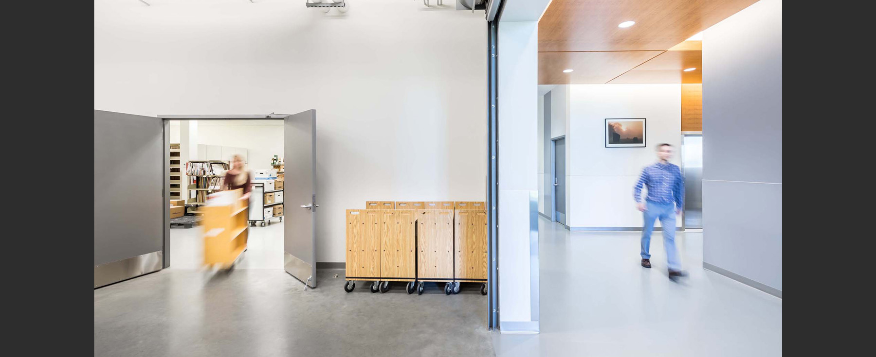 The storage facility will house and store books, press materials, files, archives, microfilm/fiche, architectural drawings and models, rare books and magazines, paintings, sculptures and more. To maximize the capacity of archival storage, the expansion has a mobile intelligent shelfing unit which moves side to side.